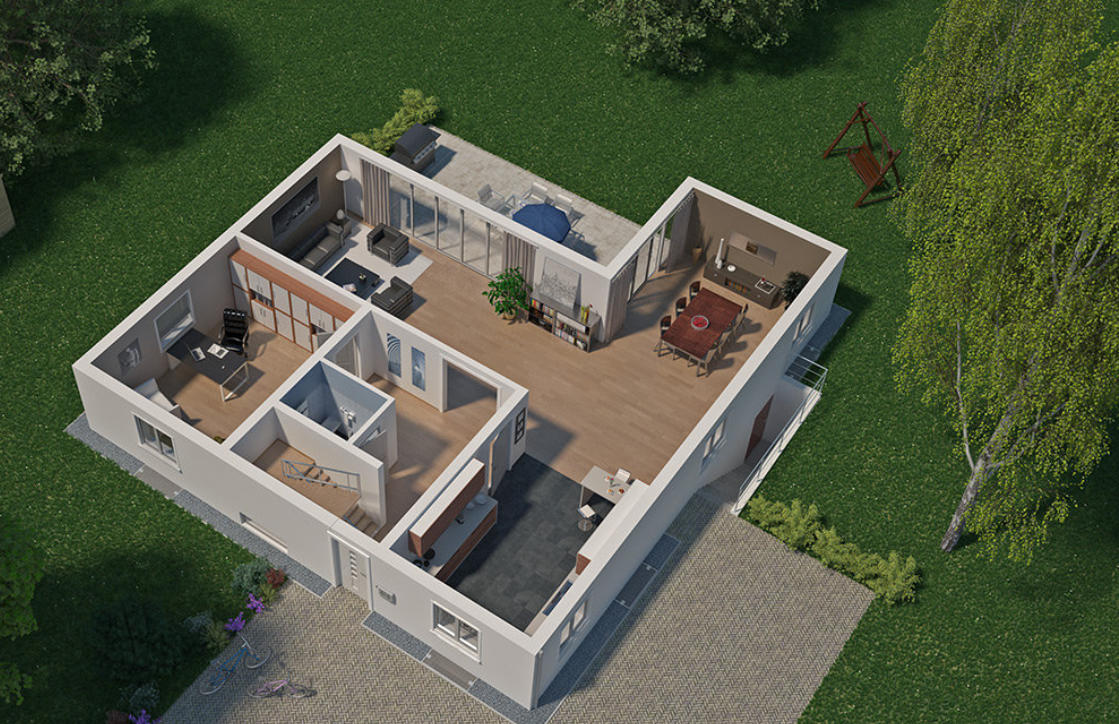 Virtuelle Haustour Unsere durchgängige 3D Planung ermöglicht es dem Kunden, zu jedem Zeitpunkt der Planung sich virtuell durch sein Gebäude zu bewegen. Mit einem Klick auf das Bild unten, gelangen Sie zu einem 3D Gebäude. Die Darstellung wird Ihnen im Browser angezeigt.